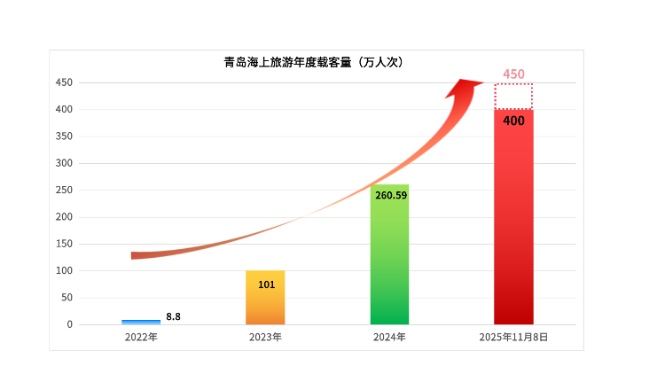 2022年,海上旅游载客量为8.8万人次;2023年跃升至101万,实现初步放量;2024年攀升至260.59万,成为青岛文旅的关键支撑;2025年,青岛海洋旅游联合运营体连续实现“六重突破”——提前48天突破百万、提前36天跨越150万、提前39天达成200万、提前4个月20天超越2024年总量、首次突破300万与350万大关,更在2025年8月10日创下日接待量突破7万人次、单日销售收入突破430万元的新高,最终于2025年11月8日12时58分成功突破400万人次。