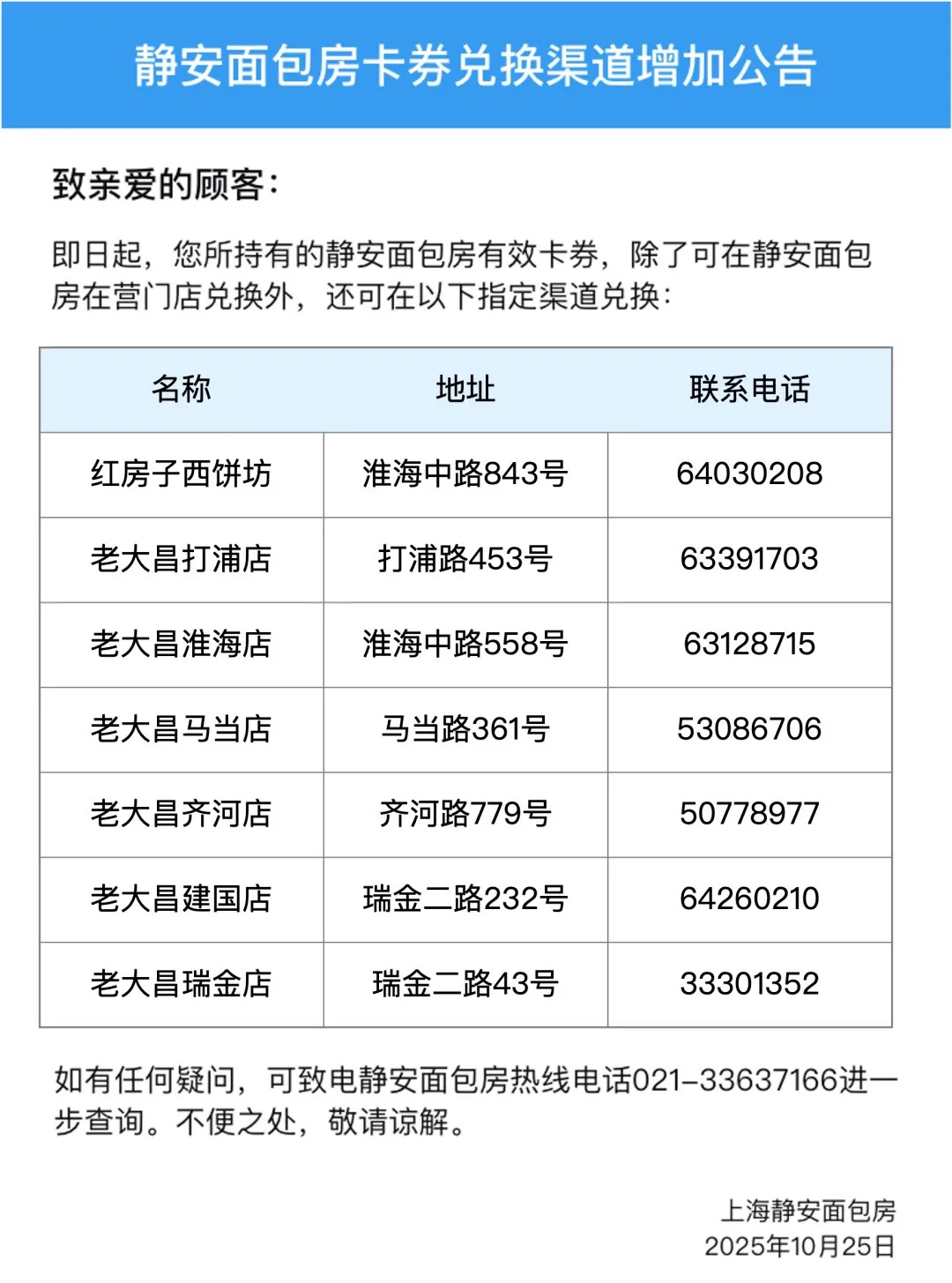 “静安面包房卡券兑换渠道公告”